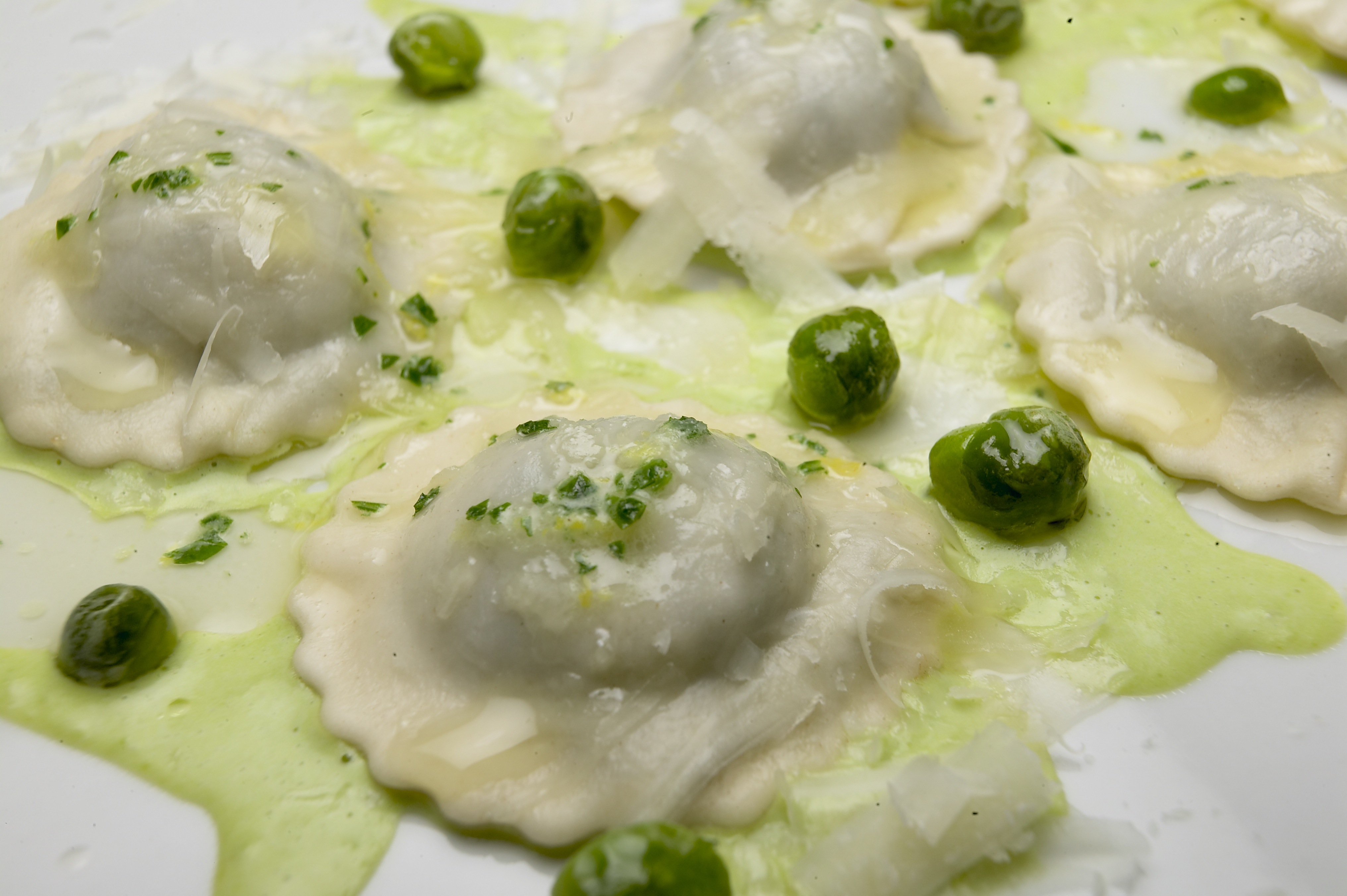 La ricetta: “Per la pasta: impastare la farina e i tuorli sino ad ottenere un’ impasto elastico. Il ripieno: pulire il tarassaco, togliendo buona parte della radice ma non eliminandola completamente; poi sbollentare. Far appassire la cipolla con il burro, unire l’uvetta tagliata grossolanamente e stufarla leggermente; poi unire il tarassaco precedentemente tritato, farlo asciugare e saltarlo qualche minuto. Farlo raffreddare. Aggiungere la ricotta, i tuorli, il Parmigiano e regolare di sale. La salsa: sbollentare i piselli, passarli in padella con olio e infine aggiungere la panna poi frullare. Tenere in caldo. Il burro: far sciogliere il burro e aggiungere la scorza di limone grattugiata. Per la pasta: tirare una sfoglia sottile, inumidire leggermente con poca acqua, fare dei mucchietti di ripieno, grossi all’ incirca come una nocciola, sovrapporre un’ altro strato di sfoglia e “coppare“ con un coppa pasta rotondo. Cuocere in abbondante acqua bollente. Impiattare mettendo un po’ di crema di piselli alla base del piatto, disporci sopra i ravioli e completare con burro profumato al limone e parmigiano grattugiato. Dosi per sei persone: “Ingredienti: Per la pasta: 250 gr farina, 8 tuorli. Per il ripieno: 300 gr tarassaco, 35 gr cipolla tritata, 50 gr burro, 150 gr ricotta, 80 gr parmigiano, 35 gr uva sultanina, 2 tuorli,sale q.b. Per la salsa: 100 gr piselli, 30 gr panna fresca. Per il burro: scorza di limone e 50 gr burro”.