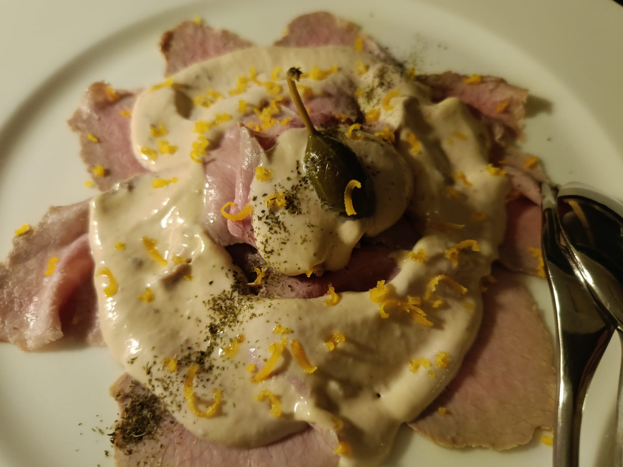Abbiamo trovato un ambiente elegante e accogliente, con una mise en place molto curata che contribuisce a rendere speciale l’atmosfera. Nonostante la pioggia non ci abbia permesso di godere della vista, d’estate la balconata offre un panorama suggestivo sul lago. La cucina è di territorio, ma interpretata in chiave creativa e sempre ben raccontata. La nostra cena è iniziata con una ricca serie di antipasti tradizionali piemontesi: lingua con bagnetto verde, vitello tonnato e altre proposte della tradizione locale. A seguire, tagliatelle ai porcini e un eccellente cervo cotto a bassa temperatura, servito con frutti rossi in stile austro-tedesco.