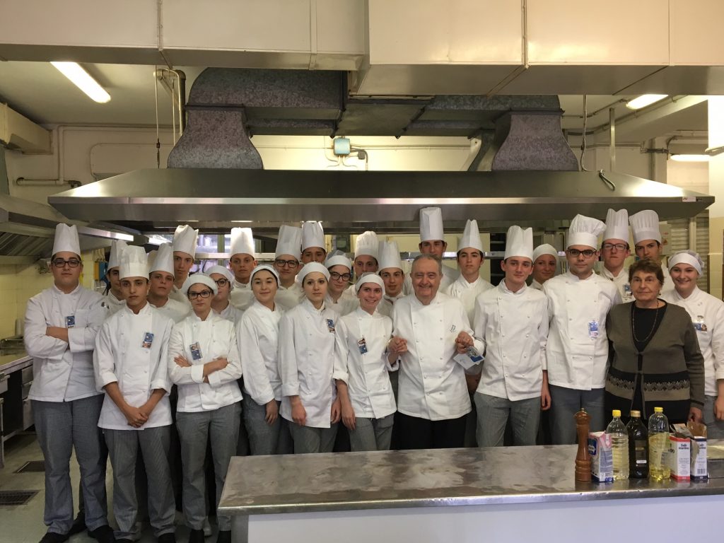 Poi sono arrivati i consigli per gli studenti: “tre consigli per fare bene uno stage in un ristorante: passione, amore, curiosità, entusiasmo”. Per lui “fare il cuoco non è un semplice lavoro, è quasi una missione. Ci vogliono infatti passione, amore, curiosità, sacrificio… tutte qualità che non sono scritte nei libri di cucina ma che avete dentro di voi. Ma, se insieme a talento e passione, non avete una grande qualità non potrete mai emozionare i vostri clienti”. E poi “dovete conoscere attentamente i prodotti che usate, sapere che quell’agnello viene effettivamente dalle Murge, conoscere come è stato allevato e cosa ha mangiato, che quel vitello è di Fassone e quel pomodoro è un cuore di bue. La mia vita è stata una continua ricerca dei migliori prodotti che la nostra Terra ci offre, da Lampedusa a Trieste. Sono stato a Pantelleria alla ricerca dei capperi e delle erbe aromatiche, che hanno particolari caratteristiche dovute al terreno vulcanico, al sole e al vento. Ho riportato in vita i fagioli di Sorana, prima IGP di fagioli in Toscana; sono stato nominato Ambasciatore della Bistecca Fiorentina… Non mi sono mai accontentato e quando trovavo la qualità, non ho mai trattato sul prezzo. Per avere una grande qualità bisogna essere disposti a pagarla, consentendo così ad allevatori e contadini di vivere dignitosamente e continuare a fornire prodotti eccellenti”.