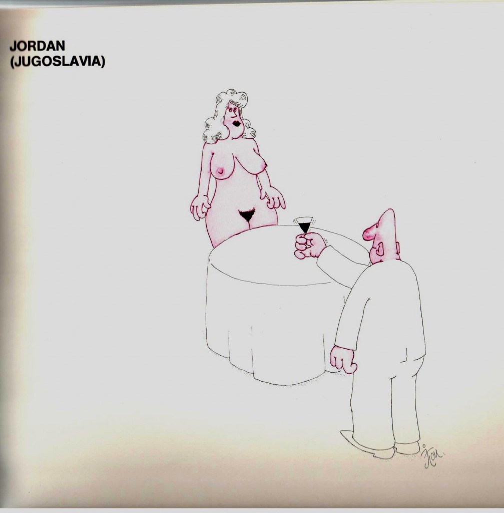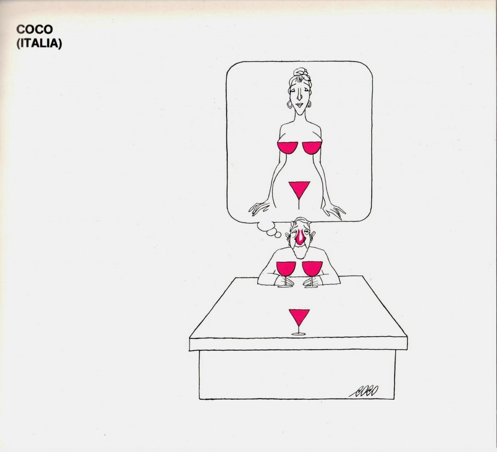 Ah, questa ambiguità semantica e la sua resa grafica mi hanno colpito e dunque, non sarà un caso, se sfogliando dei vecchi libri di vignette sul tema vino, regalatimi da Michela, ho trovato tracce di giochi maliziosi, un po’ meno diretti della pubblicità, fra forme e colori, funzioni e sapori… Le vignette sono tratte dal catalogo della 4a Rassegna Internazionale di Grafica Umoristica di Asti, 1981 e sono alcune fra molte. Sono tutte ben fatte: a volte divertenti, ironiche, ammiccanti, sarcastiche… Eccone due…
