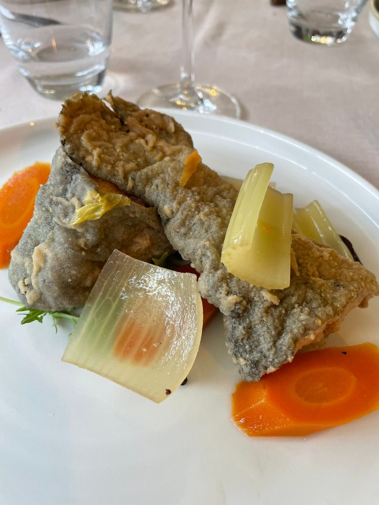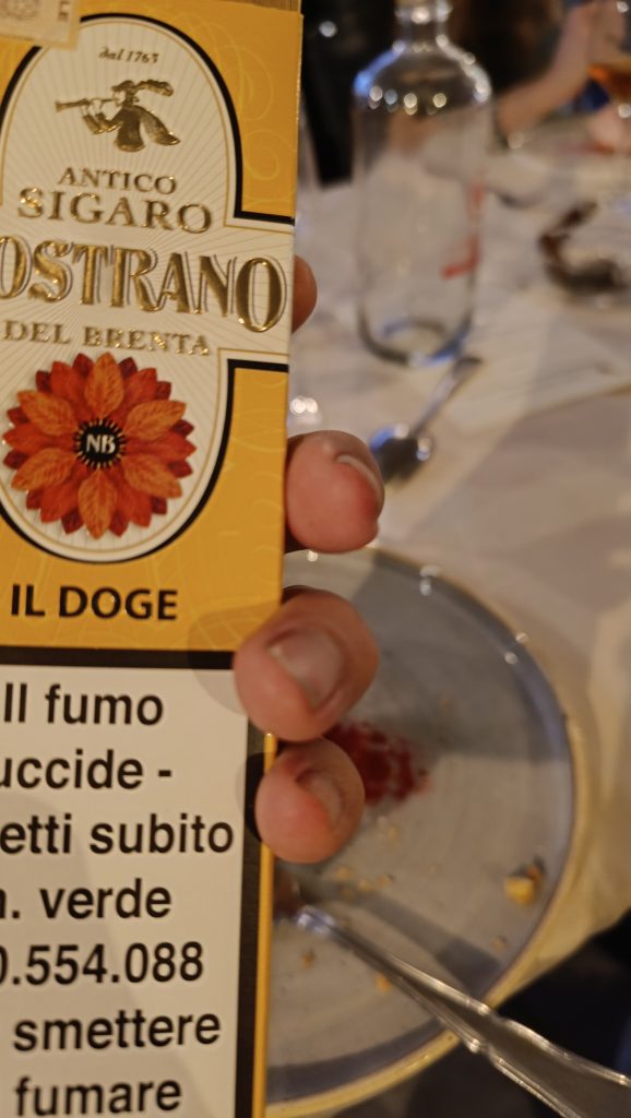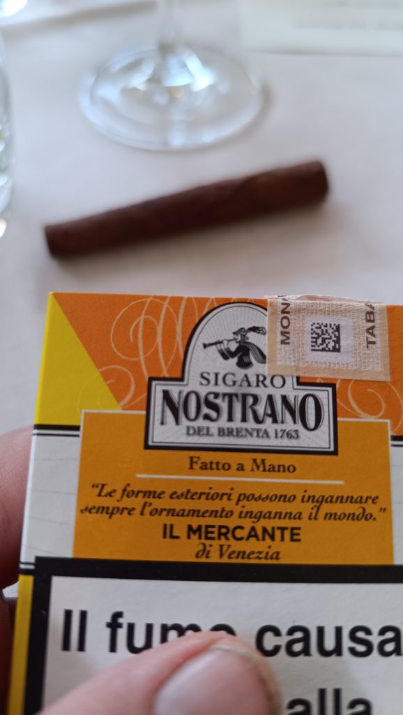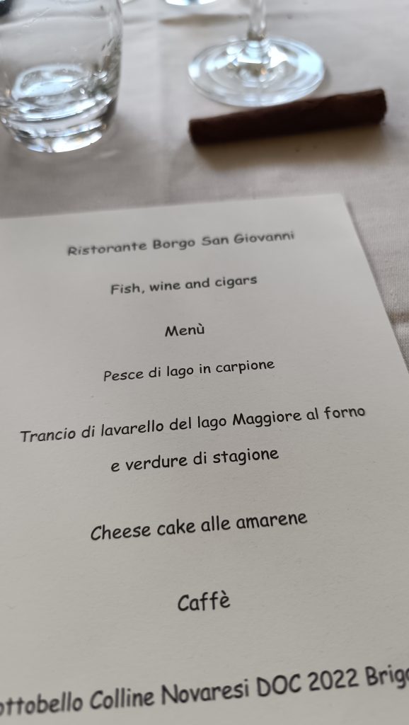 Seratona la serata di ieri sera al Ristorante Borgo San Giovanni di Lesa. Lì, complice Franca Comparetto di Cigarsense, la nostra condotta Slow Food Verbano e Cusio ha organizzato una cena dedicata ai pesci locali, del Lago Maggiore, e alla cucina tradizionale; ma soprattutto una lezione – degustazione con i sigari: due sigari veneti, di Bassano del Grappa: un po’ “piccante” Nostrano del Brenta Il Mercante, con foglia brasiliana e tabacco indigeno; ed uno più importante e dolce Il Doge, sempre Nostrano del Brenta. Un sigaro puro, fatto solo con tabacco locale. Il produttore si è collegato in call ed ha spiegato modalità tradizioni, gusti… un mondo!