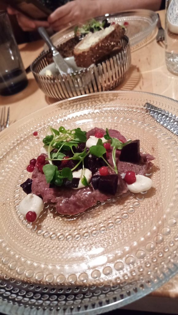 Un’altra specialità è senza dubbio la zuppa di salmone, e non un salmone qualsiasi ma quello del Golfo di Finlandia: un salmone selvaggio, non coltivato, con zero grasso. La zuppa può essere un antipasto o un main course, una portata principale; noi in quell’occasione abbiamo optato per l’antipasto, che però era una porzione più che generosa. Il brodo è composto con una crema di panna acida, abbondante aneto e, su questo letto acido, uno spettacolare filetto di salmone grigliato! Una gioia per gli occhi e per il palato. Ad accompagnare questa entrée, un altro antipasto: questa volta non abbiamo resistito e abbiamo provato la tartare di renna. Mi è rimasto il dispiacere di non essere più tornata da Kuu per riassaggiarla; la sento ancora, la battuta vellutata, corposa e quel sapore pungente accompagnato da ciuffetti di maionese e dagli immancabili cetriolini sott’aceto. Vi giuro che me la sogno di notte, davvero squisita!