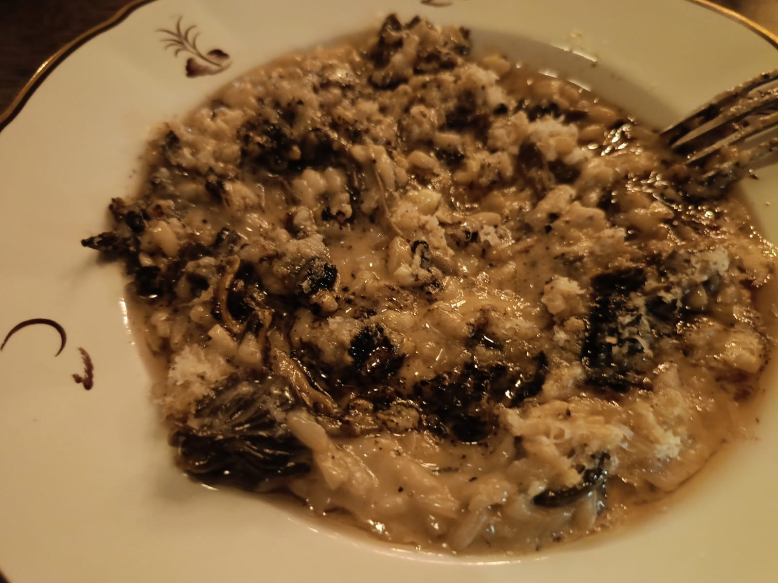 In alcuni ristoranti, specie quelli più trendy e di livello, in attesa dell’ordine vi porteranno del pane di segale con del burro. Da Pompier il livello è superiore: l’ambiente è romantico, elegante, intimo, illuminato da mille candele e specchi. Vi giuro che sono impazzita alla ricerca, nei vari supermercati, dello stesso pane da portare a casa da far gustare a Riccardo: un pane di segale morbido e umido con una crosticina come di panpepato, dolciastra, da accompagnare a un burro montato così spumoso che sembrava panna montata, aromatizzato al tartufo. Non potevo quindi che scegliere un risotto ai funghi della foresta norvegese — tendenzialmente finferli, gallinacci e porcini — ma qui c’era anche del tartufo e un po’ di olio aromatizzato al tartufo. Vi assicuro che, con le raffiche di vento gelido e il freddo della scorsa settimana, è stato davvero un piatto caldo, avvolgente, un po’ terroso ma molto corroborante.