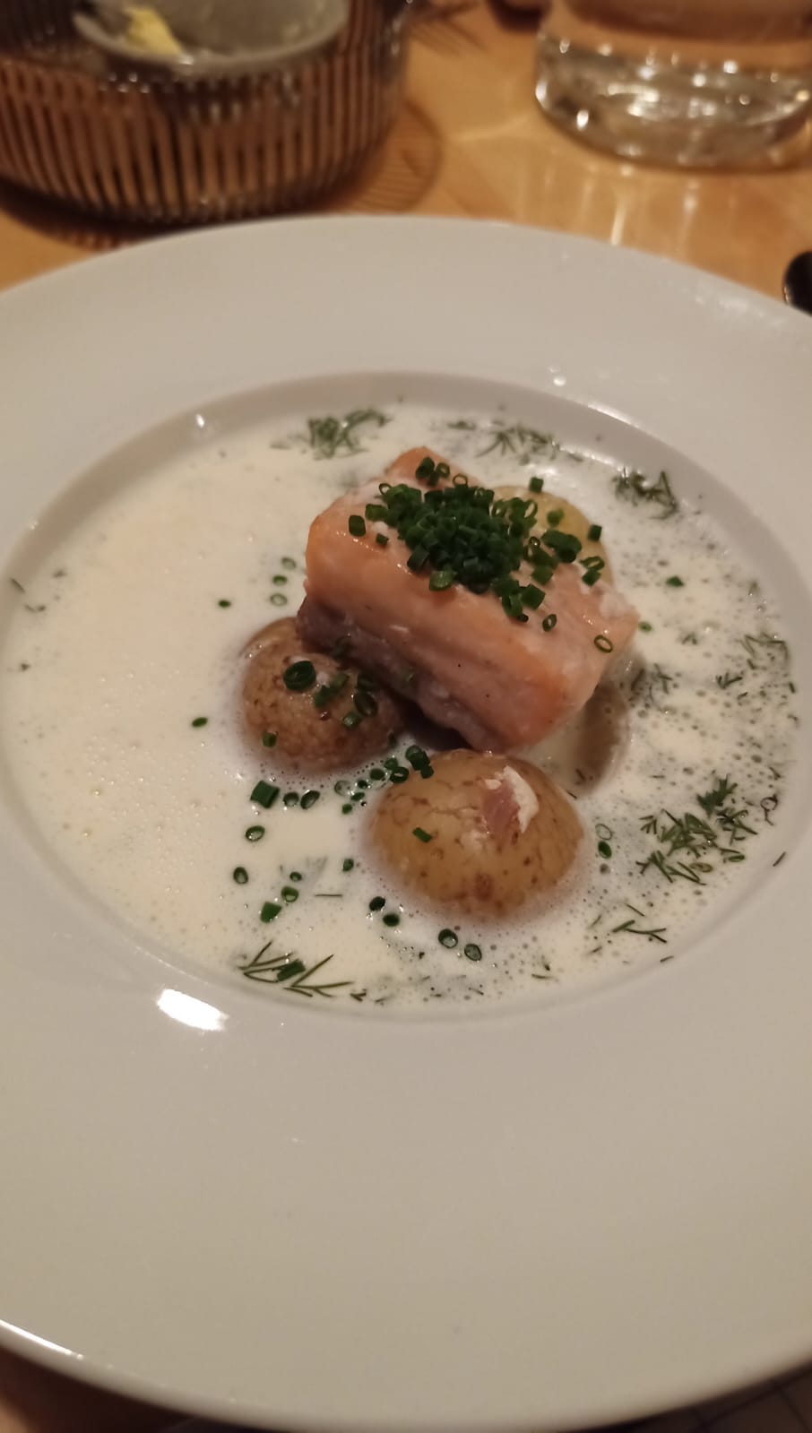 Un’altra specialità è senza dubbio la zuppa di salmone, e non un salmone qualsiasi ma quello del Golfo di Finlandia: un salmone selvaggio, non coltivato, con zero grasso. La zuppa può essere un antipasto o un main course, una portata principale; noi in quell’occasione abbiamo optato per l’antipasto, che però era una porzione più che generosa. Il brodo è composto con una crema di panna acida, abbondante aneto e, su questo letto acido, uno spettacolare filetto di salmone grigliato! Una gioia per gli occhi e per il palato. Ad accompagnare questa entrée, un altro antipasto: questa volta non abbiamo resistito e abbiamo provato la tartare di renna. Mi è rimasto il dispiacere di non essere più tornata da Kuu per riassaggiarla; la sento ancora, la battuta vellutata, corposa e quel sapore pungente accompagnato da ciuffetti di maionese e dagli immancabili cetriolini sott’aceto. Vi giuro che me la sogno di notte, davvero squisita!