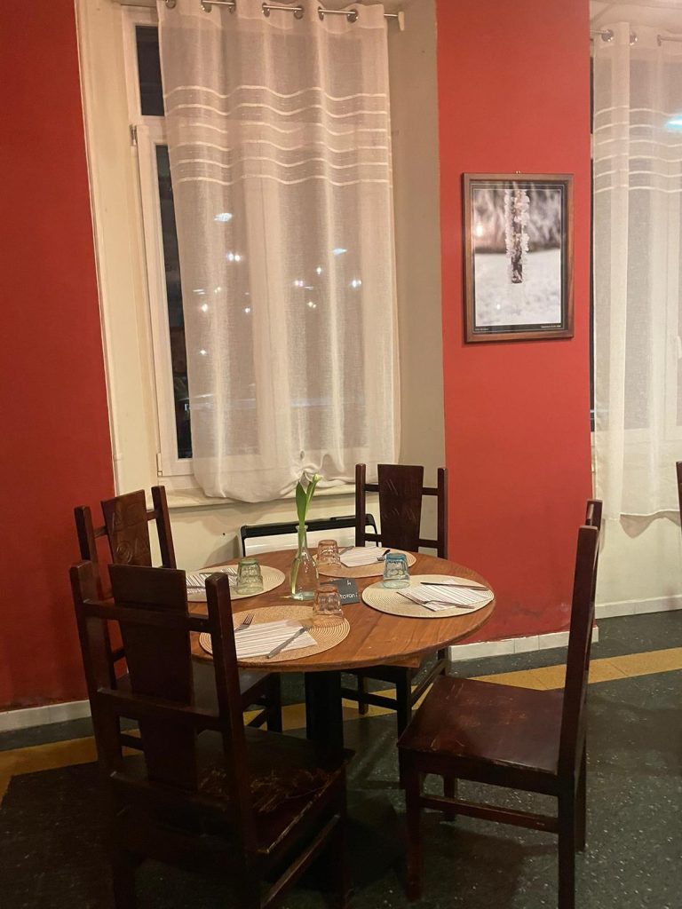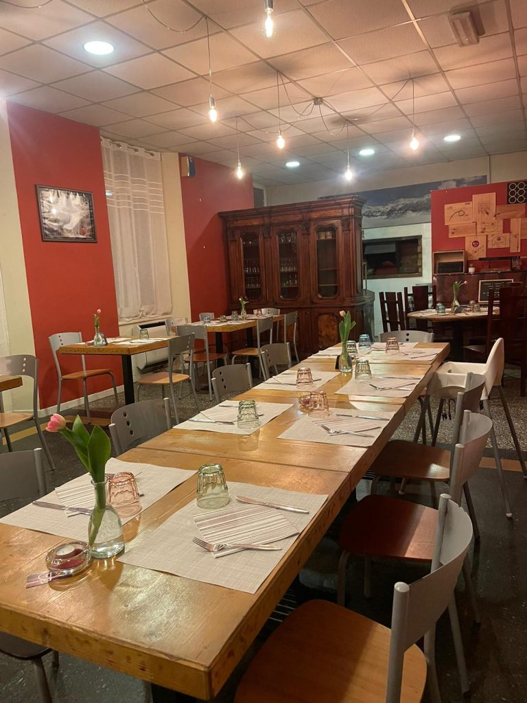Il paese sembra vuoto e buio e scuro, solo le auto a dare del colore. Capisci che c’è vita, ma poca. E poi la luce del ristorante ed entri per mangiare. Semplice, per certi aspetti un po’ freddo nell’arredo; ma c’è un fiore fresco, uno bello e colorato, ad ogni tavolo. E capisci che c’è del calore, della grazia, dell’eleganza. Una “ginestra” che rompe il grigio. Bello.