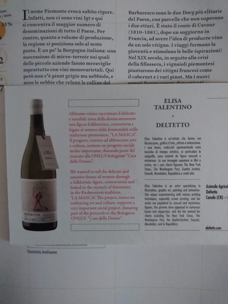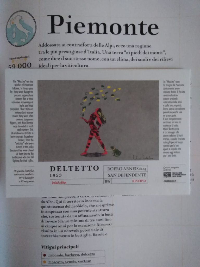 Si può fare da poco, infatti, l’arneis roero docg riserva. Un vino bianco ben strutturato e destinato a durare per anni. Stile francese per intenderci. Il primo che noi abbiamo assaggiato è il Deltetto 1953 anno 2017. Un vino assai corposo, profondo, morbido e fresco… vino che durerà anni, certo. In etichetta un bel disegno di Elisa Talentino, con oscuri riferimenti ad una personalità magica: una “masca” appunto. Dalle 1979 bottiglie 60 magnum realizzate si ricaveranno anche dei soldi da destinare alla Casa delle Donne di Bologna. Bella iniziativa.