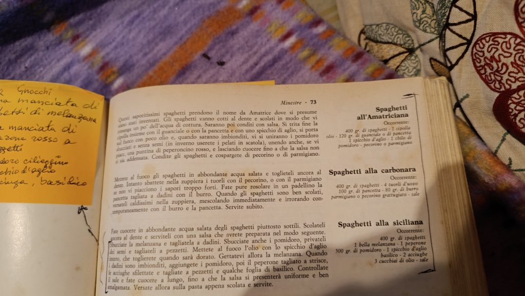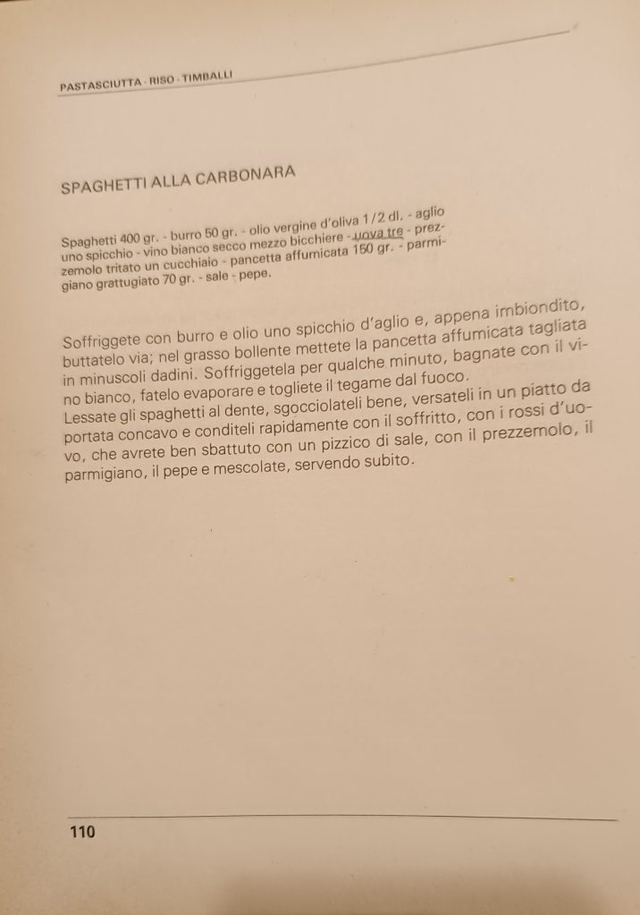 In due libri di ricette, uno degli anni Sessanta ed uno di inizio anni Ottanta, mi cade l’occhio sulla ricetta della Carbonara. Non c’è l’odiata panna ma c’è la pancetta. E in una anche l’aglio. Differiscono di poco per il resto. Ma una domanda sovviene: sarebbero accettate oggi?