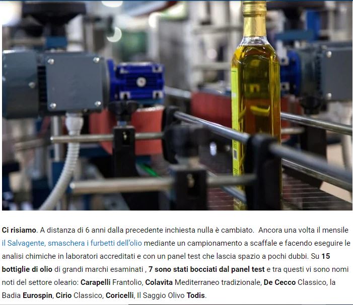 Ecco, sono davanti allo scaffale degli oli e cerco un olio dop o, almeno, igp. Dunque… eccone uno biologico, uno delicato, uno italiano, uno in offerta… in alto a destra un olio incartato in pellicola d’oro: l’unico olio dop di un supermercato neanche male. Non un discount, non una catena straniera… Eppure di oli dop davvero pochi. Anzi, uno solo. E poi oli a tre, quattro euro… troppo pochi per essere artigianale, per avere una storia. Se va bene sono miscele di oli comunitari e/o extracomunitari; se va male sono oli rettificati etc etc Non fanno male, per carità, ma dove è l’indignazione collettiva per i prodotti che fanno italian sounding come i prosecchi brasiliani, i finti parmigiani americani… Sarebbe come vendere del vino “rosso delicato” o “bianco fruttato” senza specificare da dove viene e come è fatto. La Coldiretti, la stampa farebbero un gran casino… invece per gli oli no, niente. Sì, la ditta è italiana ma certo questo non è di per sé una garanzia. Ci sarebbe da sperare a questo punto che la UE decidesse di vietare la vendita di oli sottoprezzo, così i sovranisti si inalbererebbero e qualcuno, forse, si indignerebbe anche per questi oli misteriosi che usano l’eco della tradizione gastronomica italiana.