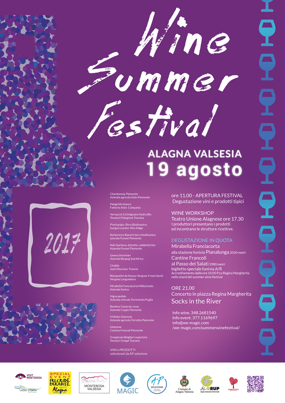 Consorzio Valsesia MonteRosa – Magic & partner. Con il patrocinio e partecipazione del comune di Alagna – Freeride Paradise special events. Il consorzio Valsesia Monterosa in collaborazione con Magic & Partner Summer Wine festival, Freeride Paradise special events e con il patrocinio del comune di Alagna, presentano La prima edizione del Summer Wine festival. Una giornata di degustazione di vini selezionati da tutta Italia e prodotti tipici locali. Scenario la splendida cornice estiva di Alagna Valsesia e le sue cime. Protagoniste dell’evento che si terrà sabato 19 agosto saranno dodici prestigiose cantine provenienti da tutta Italia fra cui eccellenze del Nord Piemonte. Inoltre saranno esposte cantine dall’Alto Adige, dalla Franciacorta, dalla Toscana, vini biodinamici ed eccellenze dell’ Oltrepo Pavese. Le cantine presenti saranno organizzate da AP selezione, leader nella selezione e distribuzione di etichette straordinarie. Alla guida Andrea Piccinno, esperto sommelier.